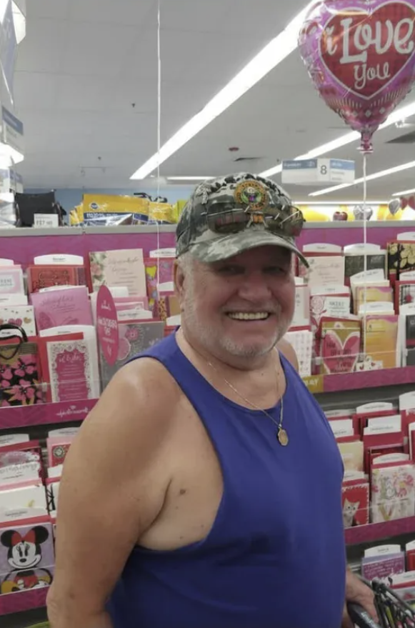 The photo shows Tom in the Valentine’s aisle, wearing a camouflage cap and blue tank top, grinning widely beneath a heart-shaped “I Love You” balloon. He’s surrounded by cards and gifts, a man on a mission to express love in every possible way.