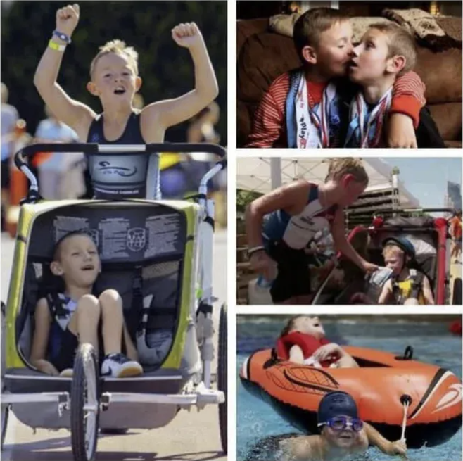 The photos show them together in various stages of races and activities. Connor pushing Cayden in specialized equipment. Cayden’s face lit up with joy. The two of them celebrating finishes, swimming together, experiencing activities that would be impossible for Cayden alone but become possible through Connor’s determination.
