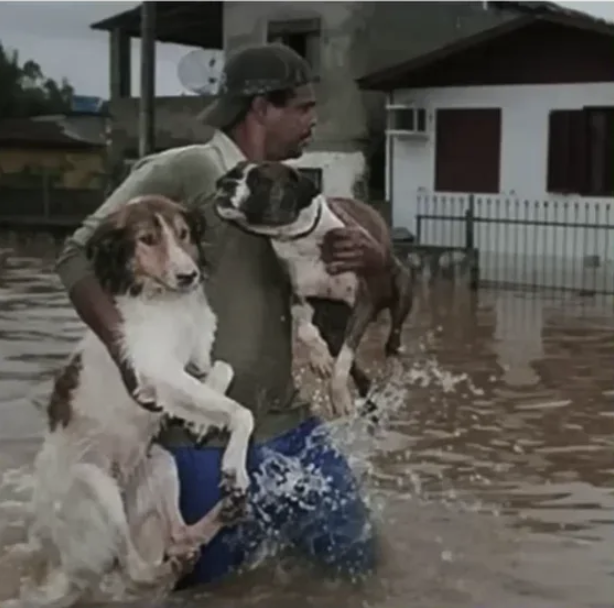 Some people abandon their pets in disasters. But this man—walking through floodwater with a dog in each arm, determined and exhausted and refusing to leave anyone behind—this man shows us what it looks like when love is non-negotiable.