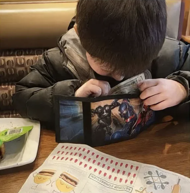 The photograph shows him at the table, carefully counting his chore money, planning how to pay for the meal and tip. He’s six years old and taking this as seriously as any adult would. Because to him, this isn’t practice. This is real. This is how you treat someone you love. This is what respect looks like in action.