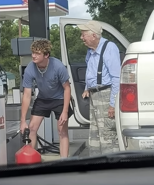 A teenager was filling up his car when he noticed an older gentleman standing quietly beside a pickup truck, holding a red gas can. The man waited patiently, almost hesitant, as if he didn’t want to bother anyone. The teen caught his eye, paused, and said, “Sir, would you let me see your can?”
