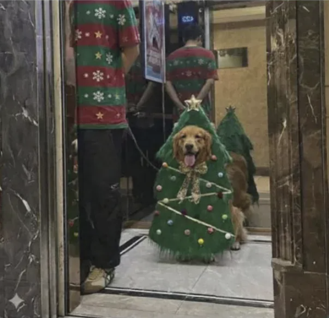 The photograph at the bottom shows someone in winter clothing standing beside a golden retriever wearing a Christmas tree costume—both looking at the camera with what might be mild embarrassment at this ridiculous outfit. The image is humorous and perhaps symbolic—showing the absurd lengths people go to with animal costumes, though in this case it’s a harmless dog costume rather than a dangerous wolf suit worn in bear territory.