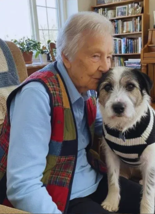 The photograph shows them together—a ninety-year-old woman with white hair and a gentle expression, wearing casual comfortable clothing, sitting beside a scruffy terrier mix who looks directly at the camera with what might be a slight smile. He’s wearing a striped sweater, suggesting she’s cared enough to dress him for warmth or comfort. They’re in a room with books visible in the background, suggesting a home filled with knowledge and culture. Both look content, comfortable together, clearly bonded.