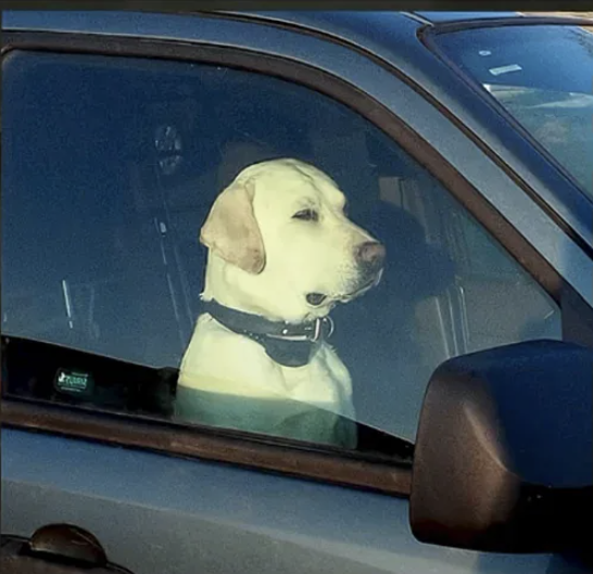 The photograph shows exactly what the officer saw: a yellow Labrador sitting in the driver’s seat, looking out the window with the dignified expression of a dog who had nothing to do with this terrible plan. The dog appears calm, unbothered, completely unaware that his owner just tried to frame him for a traffic violation.