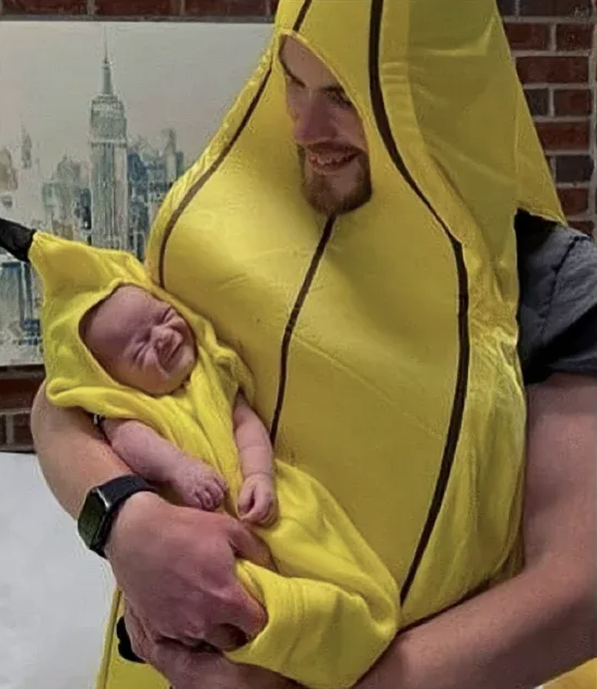 While she was at the grocery store, he executed his plan. He grabbed both costumes, quickly got himself dressed in one, wrestled his giggling daughter into the other, and positioned them both in front of the door. Two bananas — one adult-sized, one tiny — waiting like the world’s most absurd welcoming committee.