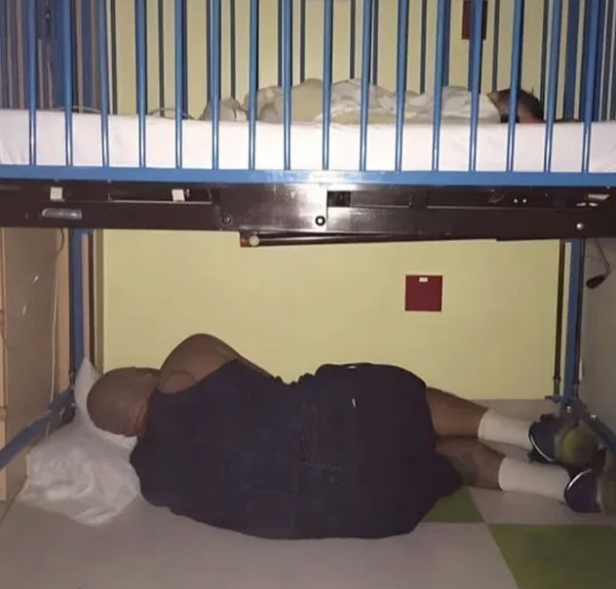 The photo shows why this story went viral. Andre is sleeping under his son’s hospital bed. Not in a chair beside it or on a couch in the room. Under the bed, lying on the floor, using the space beneath his child’s bed as his resting place. Because that’s the only spot available, or because it felt closer to his son, or because he was so exhausted he just collapsed in whatever space he could find.
