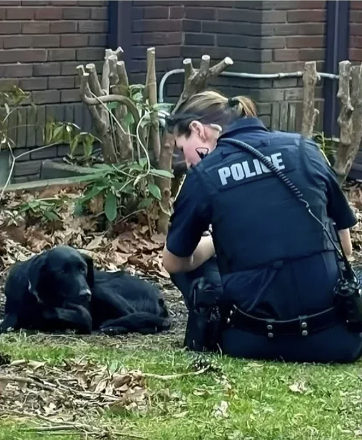The photo shows a police officer kneeling beside Bruno, trying to comfort the grieving dog. Bruno lies in the yard, still present at what must be Robert’s home, still refusing to fully accept that his master is gone. The officer’s body language shows compassion—not trying to force Bruno to move, just offering comfort to a creature experiencing profound loss.