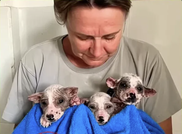 The photograph shows the result of Elara’s discovery — a woman (presumably Elara’s owner) holding three tiny puppies wrapped in blue towel. The puppies appear newborn, eyes not yet open, so young they’re barely recognizable as dogs. Their faces show the wrinkled vulnerability of brand-new life.
