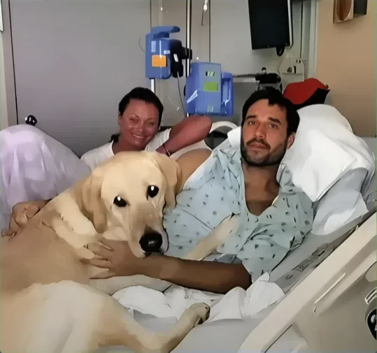 The dog didn’t hesitate. He walked through the halls like he knew exactly where he was going. Nurses stepped aside. Visitors paused. When he reached room 304, he didn’t bark or whine. He simply walked to the bed, climbed up carefully, and lay down on his owner’s chest. The man wrapped his arms around him, burying his face in the dog’s fur. The dog stayed perfectly still, his body warm and solid, his breathing steady. He didn’t move for hours.