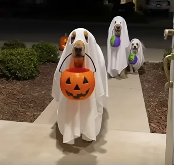 Standing on your porch are three dogs dressed as ghosts. White sheets draped carefully over their heads, eye holes cut so they can see, little pumpkin buckets held gently in their mouths. They’re not barking. Not jumping. Just standing there patiently, waiting, their tails wagging beneath the sheets, their whole bodies vibrating with the excitement of being part of something special.