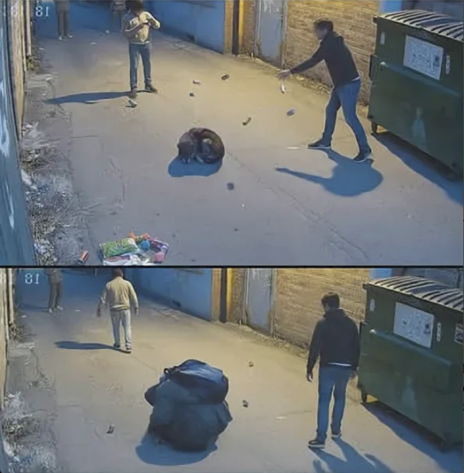 Kneeling down, shielding the trembling dog with his own body until the teens scattered. The dog was trembling. Terrified. Being attacked by multiple people throwing objects. And then this man appeared. Knelt down. Made himself a shield. Stayed there—vulnerable, exposed, absorbing whatever the teenagers threw next—until they finally left.