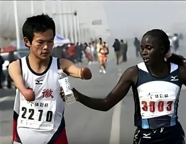 The disabled athlete finished the marathon. Because a Kenyan runner who was leading the race decided his finish mattered more than her victory.