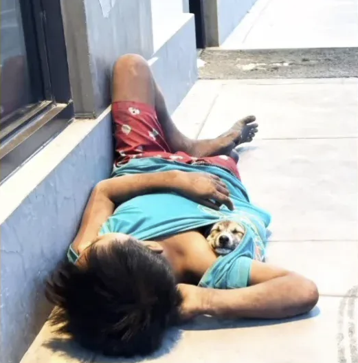 But he’s not alone. Curled against his chest, a small dog rests peacefully, tucked into the safety of his arms. The dog doesn’t care that they have nothing. Doesn’t care that there’s no bed, no roof, no certainty about where the next meal will come from. The dog only knows one thing: this person is home.