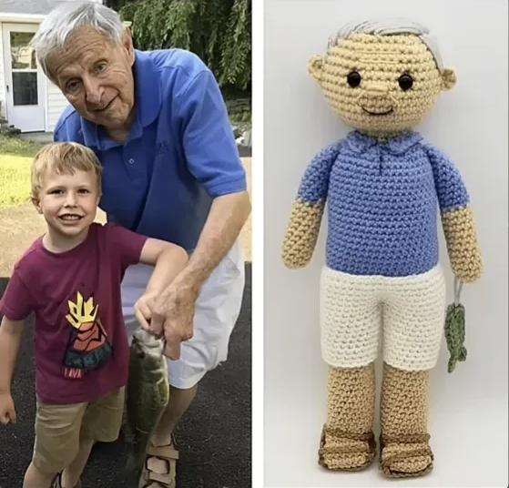 She knitted a large stuffed Pop. Exactly like the photo—blue shirt, white pants, even the fish in his hand. She put hours into getting the details right, making sure that when the boy held this stuffie, he would see his grandfather. Not a generic toy, but Pop. His Pop. The one who loved him and taught him things and made him feel safe.