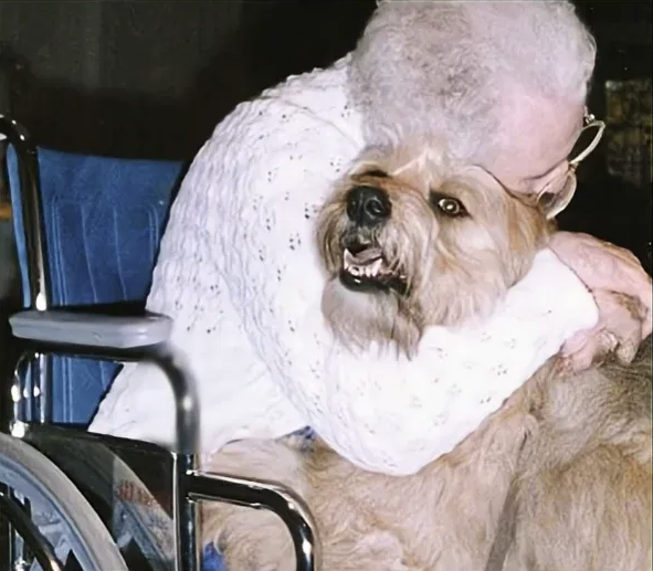 Not with the uncertainty dogs sometimes show around strangers, but with purpose and recognition. Xavy understood — in whatever way dogs understand human pain — that this woman needed comfort. They hugged, the elderly widow and the dog, holding each other with mutual need.
