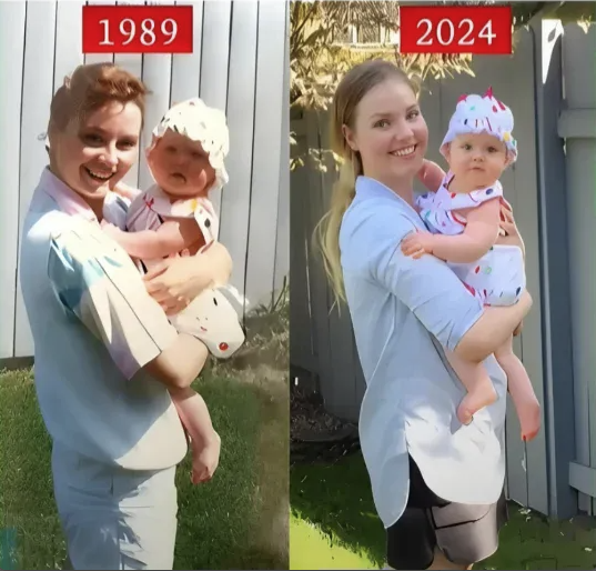 A husband shared two photos online that stopped people mid-scroll. In the first, taken in 1989, a young mother cradles her baby daughter, smiling with the kind of joy that only comes from holding new life. The baby looks up at her with wide eyes, trusting and content, wrapped in her mother’s arms like the safest place in the world.