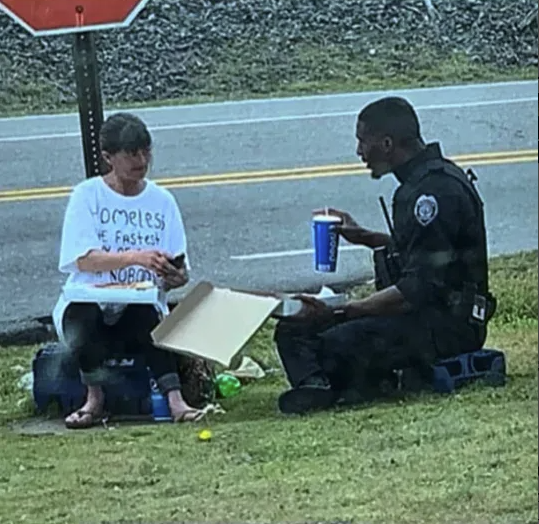 The woman was homeless. Her sign said as much. She’d probably been sitting there for hours, holding it up to passing cars, hoping someone would stop, would help, would see her as more than just a problem to look away from. Most people didn’t stop. Most people avoided eye contact, turned up their music, pretended she wasn’t there. But this officer didn’t do that. He saw her. And instead of moving her along or treating her like a nuisance, he sat down beside her and shared his lunch.
