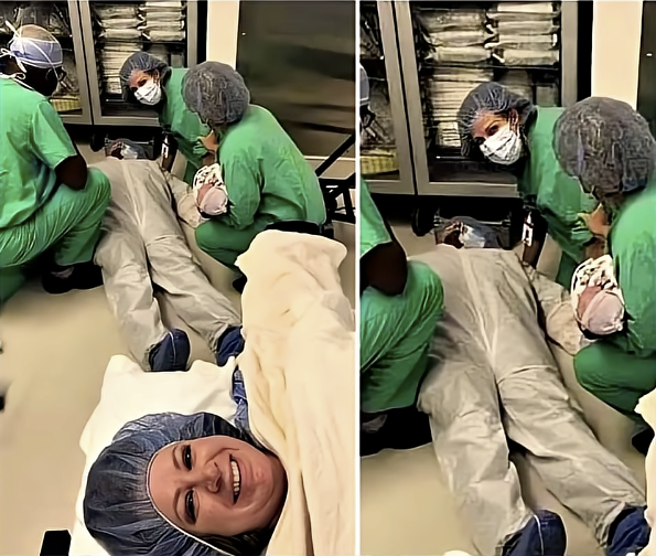 Doctors and nurses quickly checked on him while still focusing on the mother, who remained the true warrior of the moment. With a mix of exhaustion and determination, she powered through labor. Between contractions and the final pushes, she somehow found the humor in the situation. Smiling through her pain, she grabbed her phone and snapped a selfie—capturing herself, her newborn, and her unconscious husband on the floor.