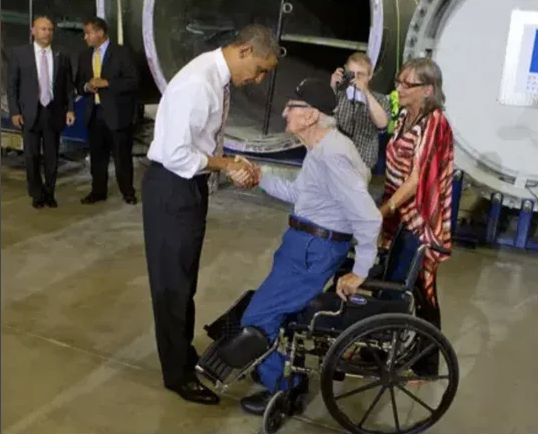 And then, late in his life, Archie met a president. The photo shows him in a wheelchair, older now, but still sharp. Still present. Shaking hands with President Obama, who leaned down to greet him with respect and gratitude. It wasn’t a publicity stunt. It was a moment of recognition. A country saying thank you to a man who’d given everything and asked for nothing in return. And Archie, humble as ever, probably just smiled and said it was no big deal. That’s who he was. A hero who never needed the title.