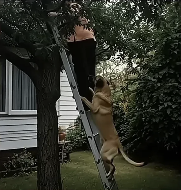 You can see it in the photograph — the dog still pulling at the ladder, still trying to communicate what he knows, still refusing to accept that his owner might not understand the warning being given. The urgency in his posture, the determination in his grip, the absolute certainty that this ladder, this tree, this moment is dangerous in ways his human cannot perceive.