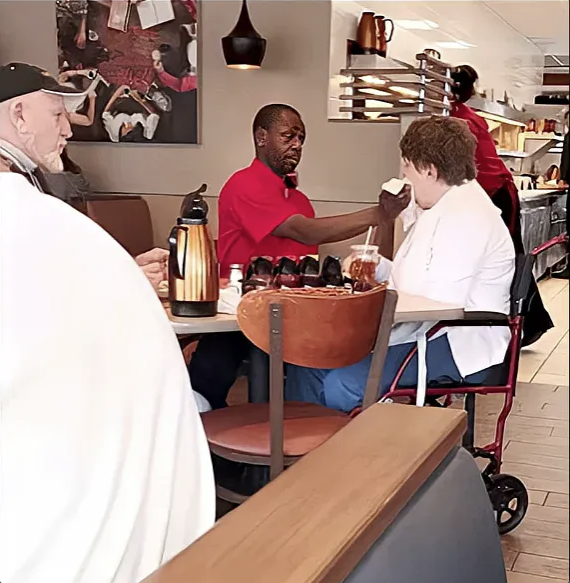 The other customers in that restaurant witnessed something rare: service that transcends profession and becomes genuine care. They saw someone interrupt the efficiency of a busy lunch shift to ensure that a woman could eat with dignity and her husband could eat without worry.