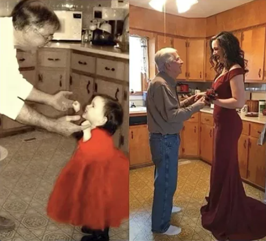 In the original photo, she was small enough to stand on his feet, her tiny hands in his, learning what it meant to be held by someone who would always catch her. He guided her through clumsy steps, patient and steady, the way fathers do when they’re teaching their daughters that the world can be gentle if you find the right partner to dance with.