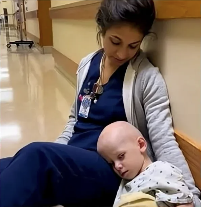 The photograph shows them—nurse and child, sitting against a hospital wall. Sam in her lap, wrapped in yellow blanket, calm now. Emily holding him, looking down at him, providing the presence that medicine couldn’t. Both exhausted. Both finding what they needed in that moment. Sam finding safety. Emily finding purpose.
