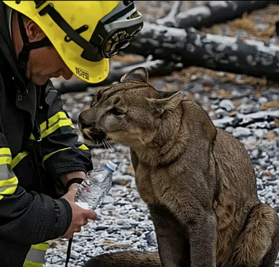 The photograph captures the moment: a firefighter in full gear, kneeling beside a mountain lion, holding out a bottle of water. The lion drinking, calm despite the chaos around her. Two beings from different worlds, connected briefly by need and compassion.