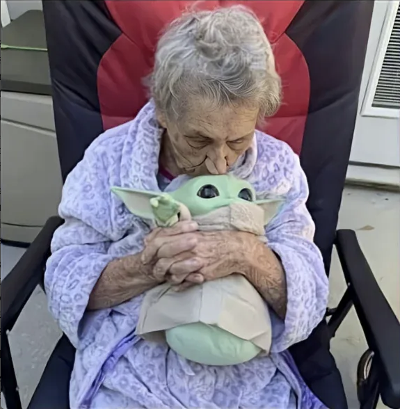 The photograph shows her holding Baby Yoda—now Lady Bug—close. Cradling him like something precious. Her face shows contentment, the kind that comes from having something to care for, something to hold, something that’s hers in a world where so much feels unfamiliar.