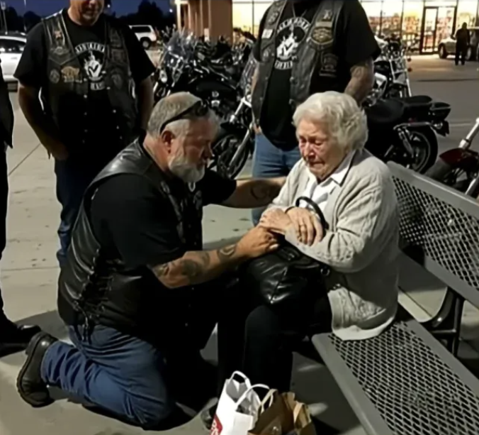 Sever bikers spotted her crying. These men—leather jackets, motorcycles, the stereotype that makes people cross the street—saw an elderly woman crying on a bench and stopped. Noticed. Cared enough to investigate.