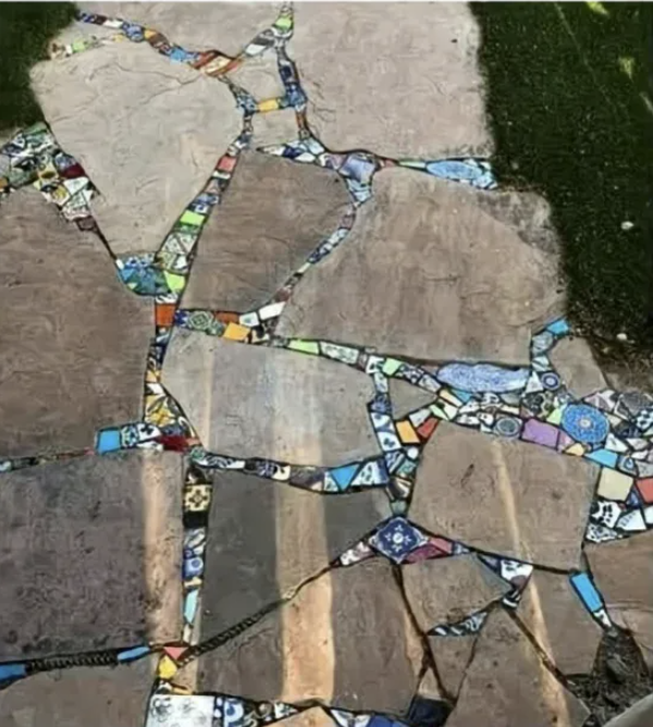Months later, I turned those broken dishes into a mosaic path. Piece by piece, I laid them into concrete, creating something that would be walked on, lived with, incorporated into daily life. And at the center—the focal point, the heart of the entire design—I placed the tiny pink teacup she’d given me at age eight.